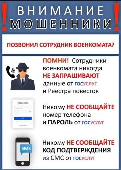 Участились случаи мошенничества, когда звонящий на Ваш сотовый телефон представляется сотрудником военкомата либо представителем Министерства обороны Российской Федерации и просит Вас для оформления документов на выплаты продиктовать личные паспортные данные (СНИЛС, ИНН) либо назвать код из СМС для подтверждения учетной записи на портале «ГОСУСЛУГИ».